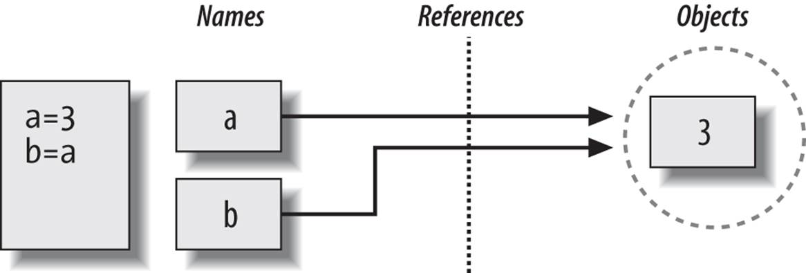 Assigning something to a variable in Python makes a name point to an actual object, so the name is only a reference. For example creating the variable a and assigning it the object 5 looks like this: